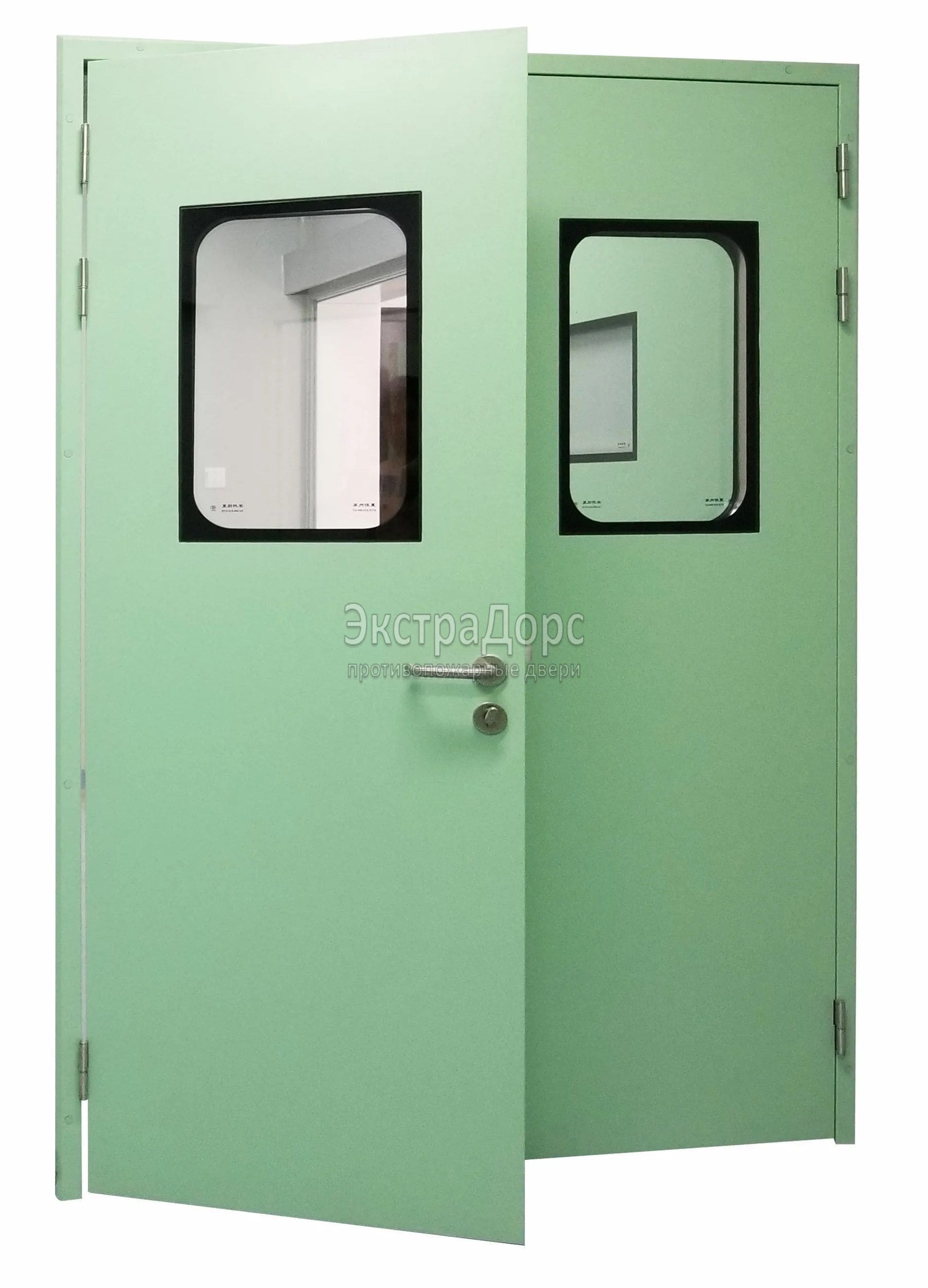 Двухстворчатая огнестойкая дверь EIW 60 зеленая со стеклом в Королёве