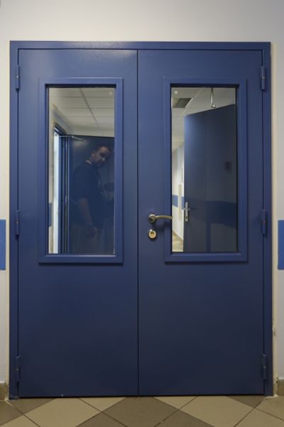 Противопожарная алюминиевая дверь синего цвета в Королёве